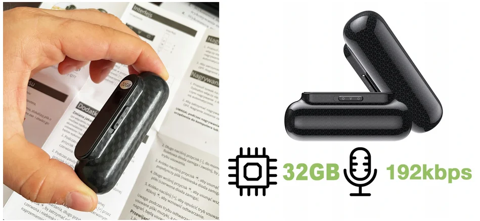 - Miniaturowy dyktafon ukryty w poręcznej obudowie, nagrywający w jakości 192kb/s – mały i dyskretny, idealny do rejestracji zdarzeń z ukrycia, jak i do zwykłego użytkowania!