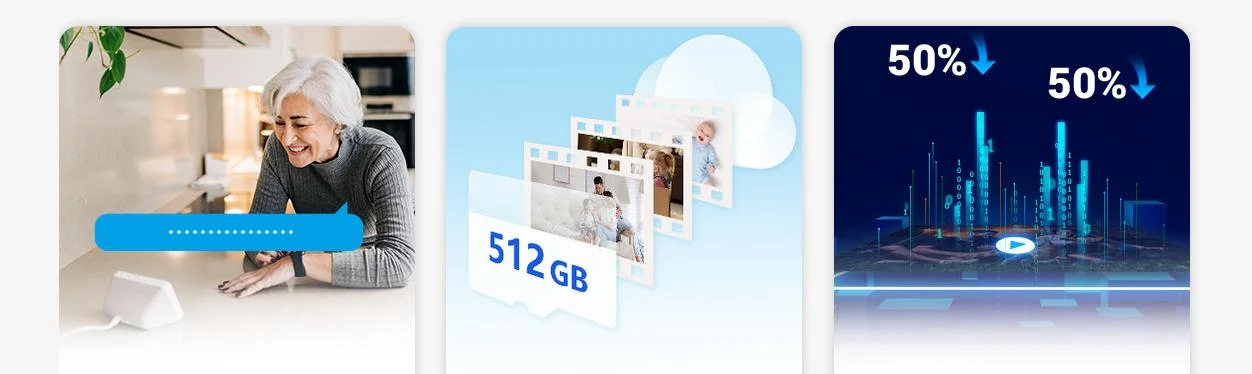 - Technologia kodowania wideo H.265: kodek H.265 zapewnia płynniejsze wrażenia z oglądania nagrań wideo, zużywając jednocześnie około 50% mniej miejsca w magazynie danych wymaganego przez kamery ze starszą technologią H.264.