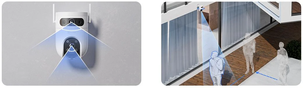 - Działaj mądrzej, dzięki połączonemu współwykrywaniu i zmianie widoku – współpraca obiektywu szerokokątnego i obiektywu obrotowo-uchylnego umożliwia kamerze bezpieczeństwa inteligentne monitorowanie środowiska. Kamera H9C jest wyposażona w technologię wykrywania z podwójnym obiektywem i połączoną detekcją, co pozwala na ochronę nawet najbardziej złożonych środowisk, dostosowaną do Twoich potrzeb.