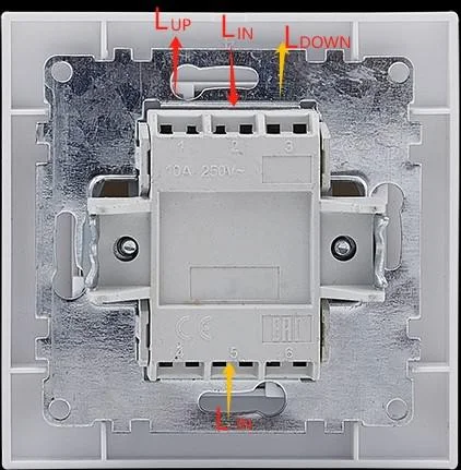Przewody zasilające N z puszki instalacyjnej (ze ściany) i silnika żaluzji N łączymy razem, tak samo przewody PE łączymy razem. Przewód fazowy L zasilający 240V podłączamy na zacisk 2 łącznika.