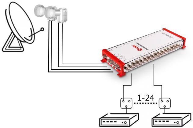 Kable antenowe przyłączeniowe sygnał do urządzenia powinny być najwyższej jakości spełniające odpowiednie normy techniczne umożliwiające prawidłową pracę urządzenia. Urządzenie umożliwia podłączenie do 24 tunerów satelitarnych. Multiswitch automatycznie rozpoznaje rodzaj sygnału jaki będzie przekazywany do tunerów.