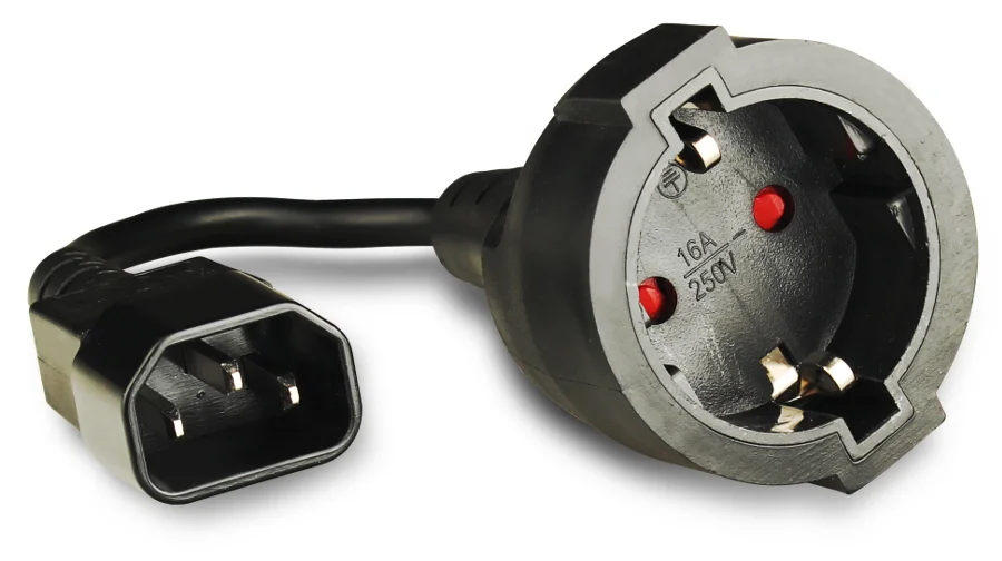 Adapter zasilania do UPS C14 -> Schuko to rozwiązanie pozwalające na podłączenie do zasilacza awaryjnego (UPS) z gniazdami C13 urządzenia wyposażonego w typowy wtyk zasilania.