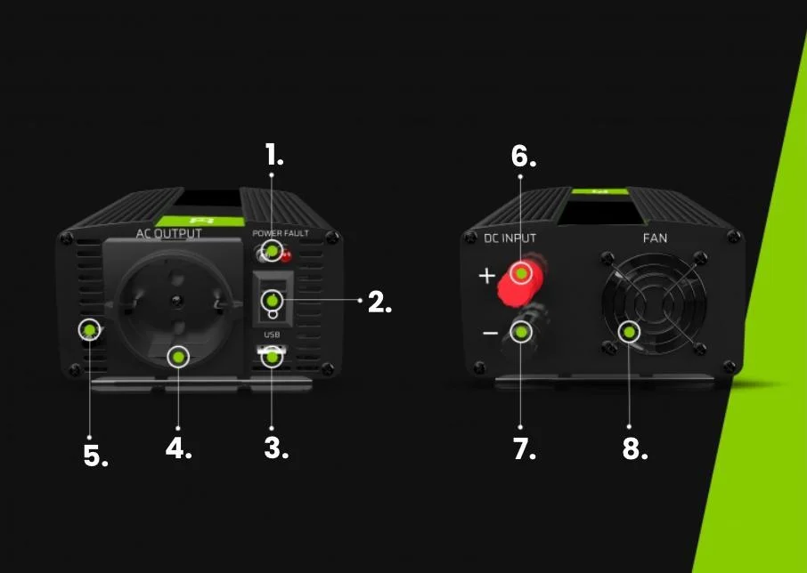 Urządzenie zostało zaprojektowane tak, aby jego użytkowanie było jak najbardziej komfortowe. Przedni panel inwertera wyposażono w gniazdo sieciowe dostosowane do wtyczek typu Schuko oraz port USB, dzięki któremu naładujemy nasz smartfon, tablet, czytnik e-booków oraz dowolne urządzenie ładowane poprzez interfejs USB.