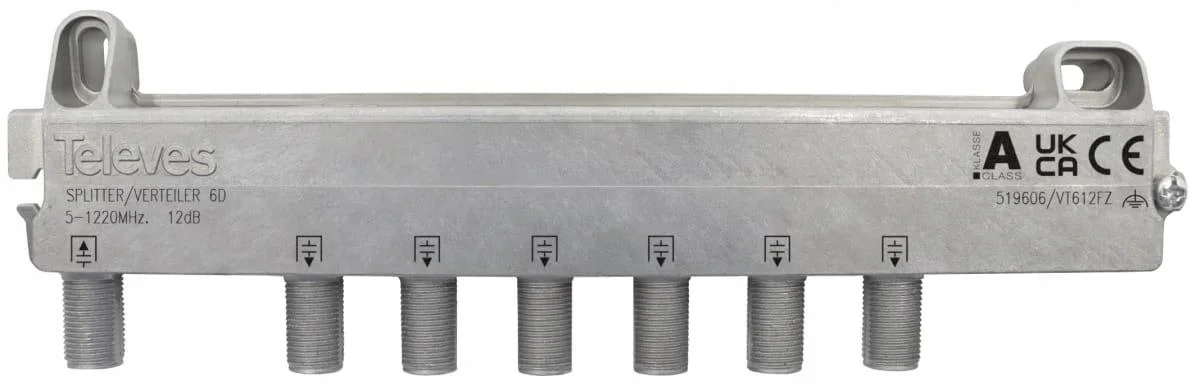 Wysokiej klasy rozgałęźnik 1/6 Televes ref. 519606, czyli 1 wejście, 6 wyjść, pracuje w zakresie 5 MHz – 1218 MHz. Umożliwia podzielenie sygnału telewizji naziemnej DVB-T2 lub kablowej DVB-C na sześć telewizorów.