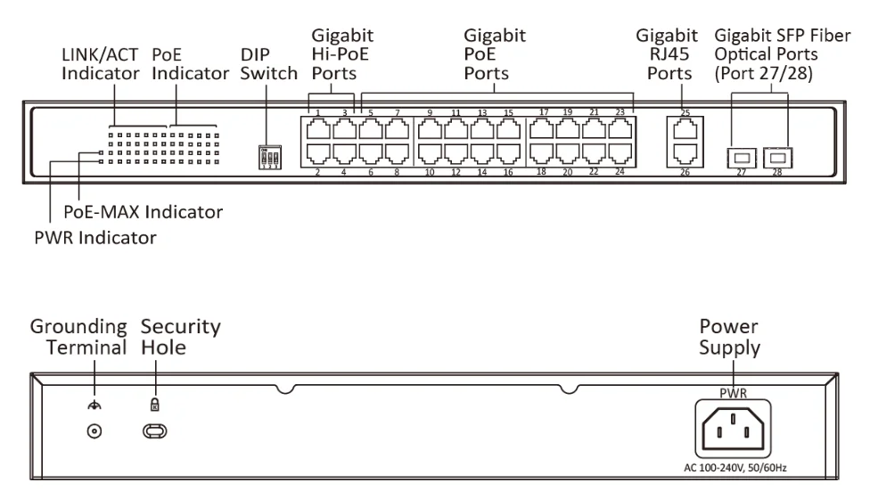 | 4 × gigabit Hi-PoE ports, 2 × gigabit RJ45 ports, and 2 × gigabit fiber optical ports | ||