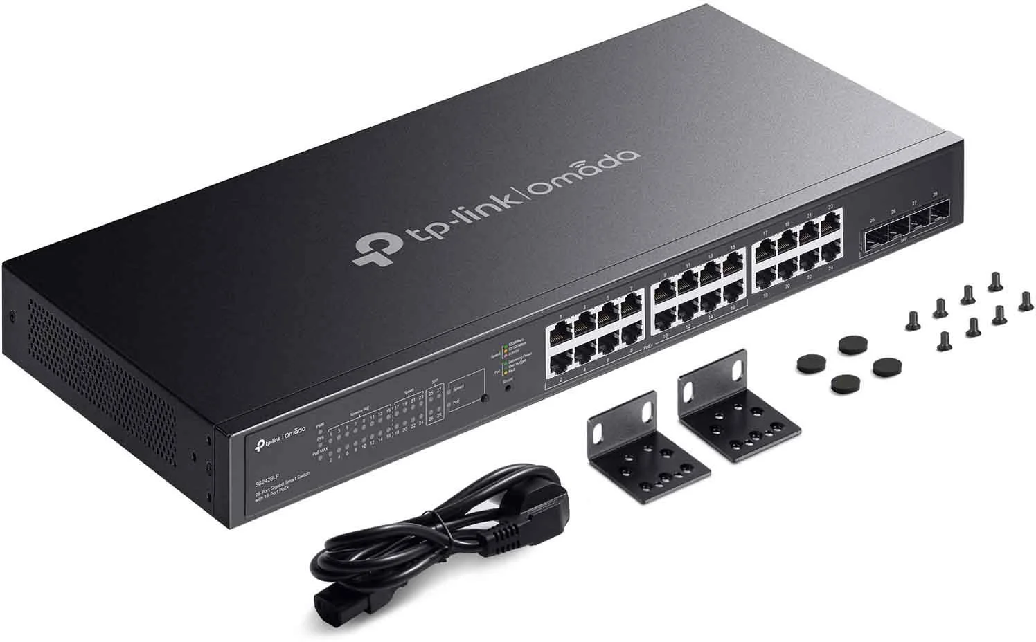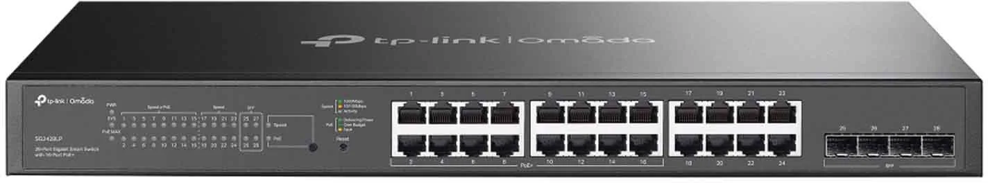 TP-Link SG2428LP to 28-portowy przełącznik Smart Omada, wyposażony w 24x porty Gigabit Ethernet, w tym 16x portów PoE+ oraz 4x sloty SFP, o łącznym budżecie mocy PoE 150 W.