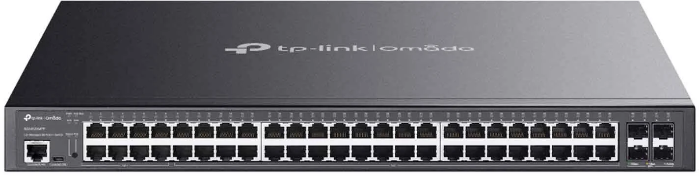 TP-Link TL-SG3452XMPP to zarządzalny przełącznik L2+ Omada, wyposażony w 48x portów Gigabit Ethernet PoE (w tym 40x portów PoE+ i 8x portów PoE++) oraz 4x sloty 10 Gb/s SFP+, port konsolowy RJ45 oraz port konsolowy micro-USB.
