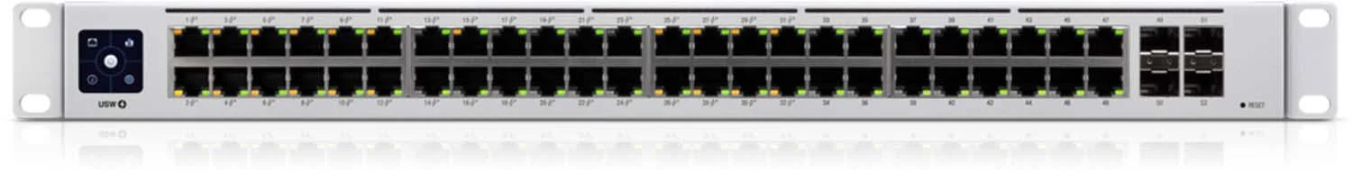 Ubiquiti UniFi Switch 48 POE Gen 2 (USW-48-POE) to zarządzalny gigabitowy switch Layer 2 z 48 portami Gigabit Ethernet, w tym 32 portami automatycznego wykrywania 802.3at PoE+ i czterema portami SFP. Zapewnia łącza Gigabit PoE do urządzeń RJ45 Ethernet oraz połączenia Gigabit fiber uplink do sieci korporacyjnej.