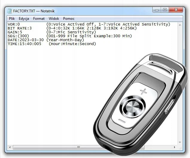 W pamięci dyktafonu znajduje się plik FACTORY.TXT dyktafon ma możliwość zmiany dodatkowych ustawień przy pomocy zmiany parametrów w pliku.